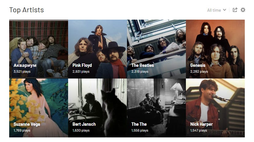 I would often have a lesson often on a Saturday morning and then stay on for lunch and good conversation. It was during those lunches that I got acquainted with the music of Vladimir Vysotsky and Akvarium, the latter of which has become one of my all-time favourite bands. They easily beat Pink Floyd, the Beatles and Genesis on my listening charts on last.fm, where I’ve been logging my music listening history since 2007.