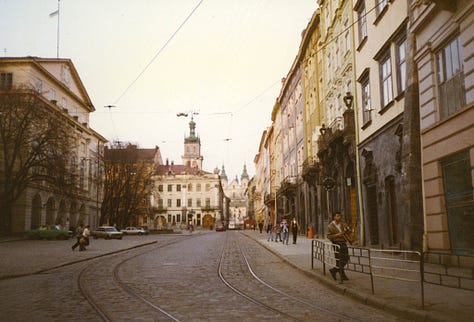 The university had arranged accommodation for us, living with families in the city, and had also organised teaching jobs for us at state schools. My room was in an old apartment building on Zhukovsky Street (now Sviatoslava Karavanskoho Street), slap bank in the city centre. My landlady lived with her teenaged son and neither of them spoke any English. I expressed dismay at that in my diary, but of course it turned out to be the best thing for my language.