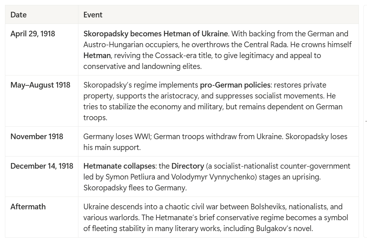 Hetman: The title (Ukrainian: гетьман) harkens back to the 15th–18th centuries, when it denoted the supreme military leader in Poland-Lithuania and Cossack Ukraine. In 1918 Skoropadsky revived this archaic title as he sought to cloak his German-backed regime in national tradition. Bulgakov himself wryly remarks in Chapter 4 that it was “a title more appropriate for the seventeenth century than the twentieth.”