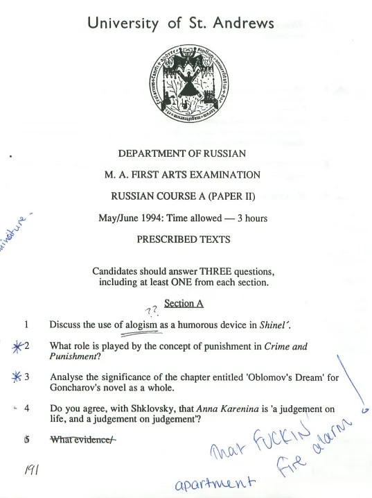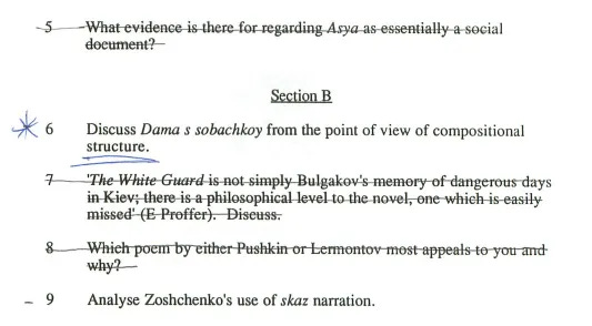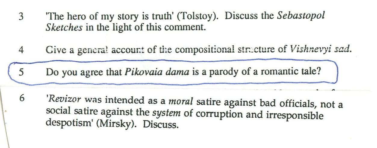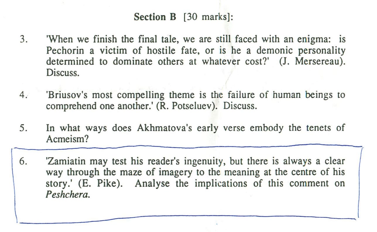 We read in Russian and in translation, mainly poetry and short stories in Russian and longer novels in translation. Titles above in Russian and English were read in Russian. I’ve cobbled these reading lists together from looking back through the essays I wrote and at the exam papers I kept. I didn’t read everything on the list due to a quirk in the system: you couldn’t do an exam question on any works that you’d written a term paper on, and for the remaining ones, you’d choose two out of four possible exam questions. So, from the list above, I skipped The White Guard and Asya—I still haven’t read them though I intend to—, and I don’t remember reading any poetry or indeed attending any poetry lectures. I only know they were on the syllabus because there are exam questions.