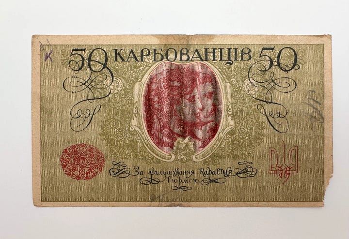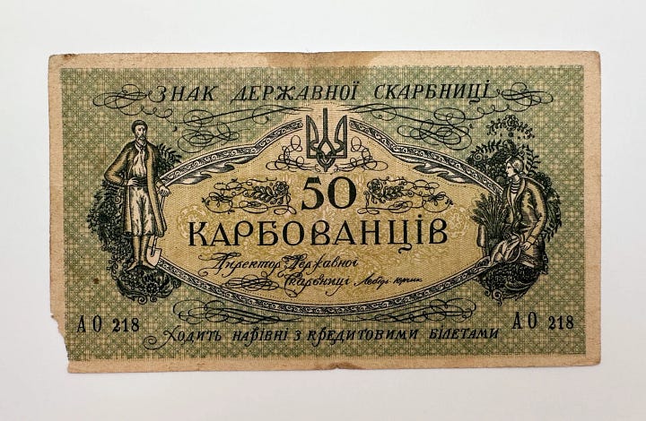 The Karbovanets was the Ukrainian currency from 1917–1920. It was reinstated twice after that, in the periods 1942–45 and 1992–96. I lived and worked in Odesa from 1995 to 1996 and this was the currency in use at that time. The currency was subject to hyperinflation and I used to be paid in millions for my teaching job. Matches and chewing gum were often used as change when buying items from the street kiosks. The Karbovanets was replaced by the hryvnia in 1996, at a rate of 100,000 karbovantsiv to 1 hryvnia.