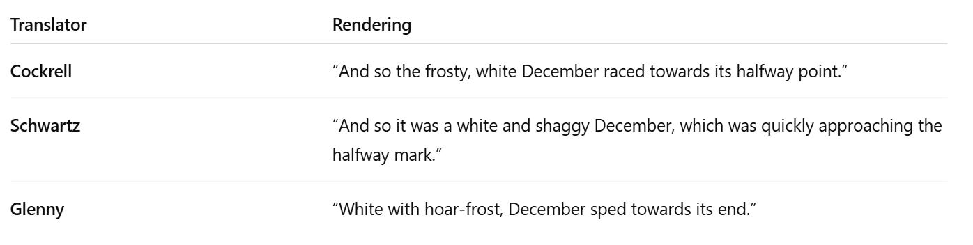 Glenny’s ‘hoar frost’ works, but it’s a common phrase. According to the Woodlands Trust, the word ‘hoar’ comes from old English and the way the ice crystals form makes it look like white hair or a beard1. But according to my bilingual dictionary, there is a direct translation into Russian of hoar frost, and that would be иней. Translation is always about choices and there are no right or wrong ways of doing it. Maybe a native Russian speaker could tell us if мохнатый sounds as weird as shaggy to describe a winter frost.