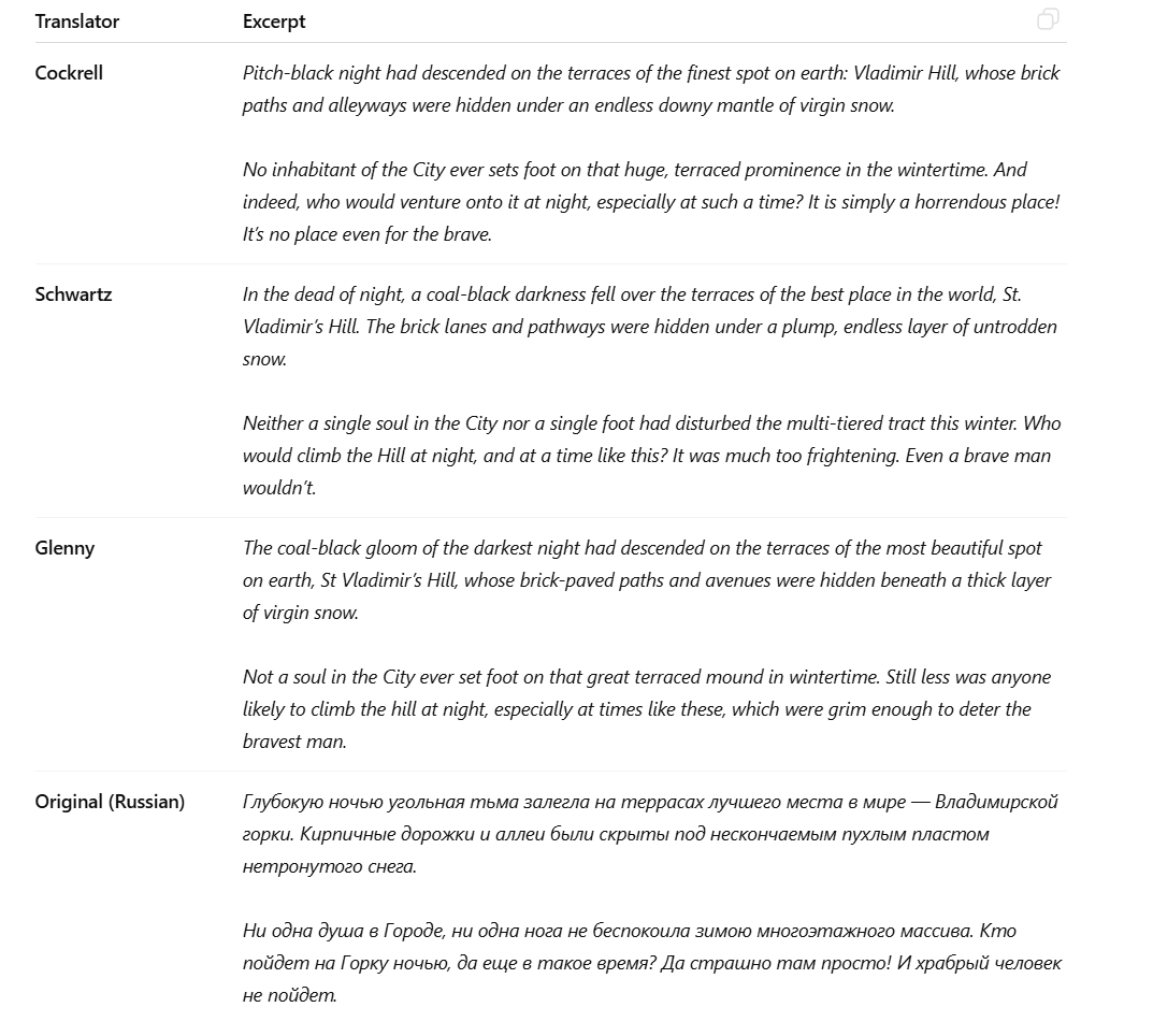 As I read this opening in the Cockrell then Schwartz, it became quite clear to me which version I prefer. Cockrell’s writing feels more evocative and less like a translation to me, but of course tastes differ and you might very well prefer Glenny or Schwartz. There are no right answers.