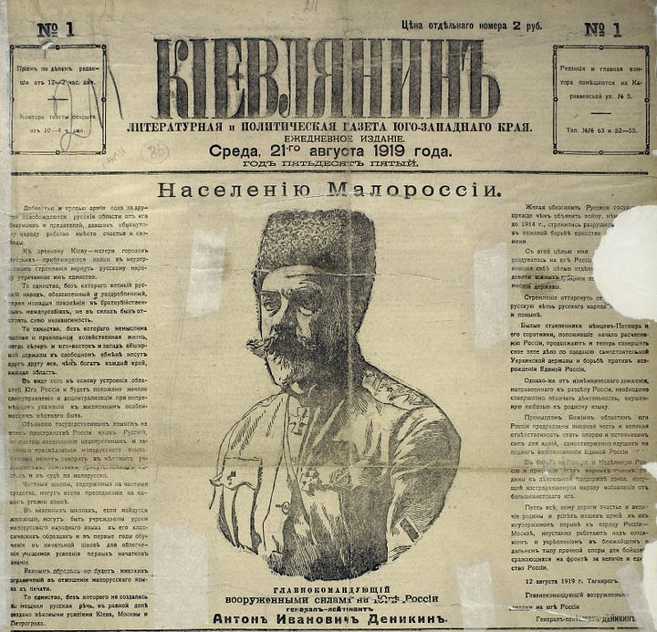 “Kievlyanin” (Киевлянин) – the long-established conservative Russian-language daily, shut down by Petlyura in late 1918.