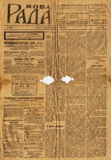 “Nova Rada” (Нова Рада) – a Ukrainian-language nationalist paper linked to the Central Rada government.