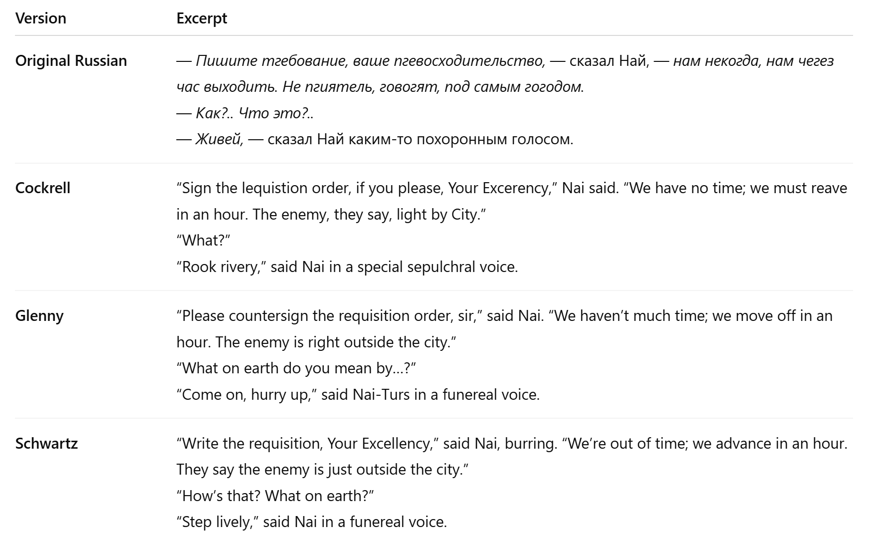 Colonel Nai-Turs has a speech impediment and it’s interesting to see how the different translators deal with it. Personally, I’m a big fan of Cockrell’s ‘Rook rivery,’ replacing Ls with Rs. Schwartz has him speak normally, but describes the impediment with a gerund: burring; and Glenny appears not to deal with it at all.