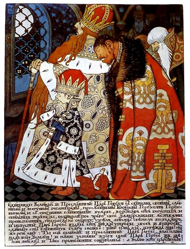 King Pea: Tsar Gorokh (literally, 'Tsar Pea') has his wife's head chopped off in a famous folktale, though he is also remembered as the 'Good Tsar Gorokh' who reigned over an idealized Russia. A striking oxymoron, 'Tsar Pea' eventually came to stand for something silly or nonsensical (SB); yet, as often in Dostoyevsky, the use of a familiar image or phrase hides depths of meaning and allusion. In an article of 1981 J. L. Rice noted that the very name 'Tsar Gorokh' is 'a perfect, ironic representation of Raskolnikov's grandiosely unbalanced Napoleonic ambition'; the essay is collected in Rice, Who Was Dostoevsky? (Oakland, California: Berkeley Slavic Specialties, 2011).4